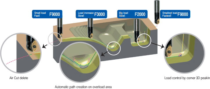 considering feedrate control, tool path addition on overload area, and automatic aircut delete.