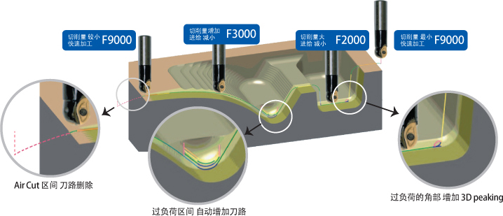 自动控制进给速度,过负荷处自动增加刀路,自动删除空刀