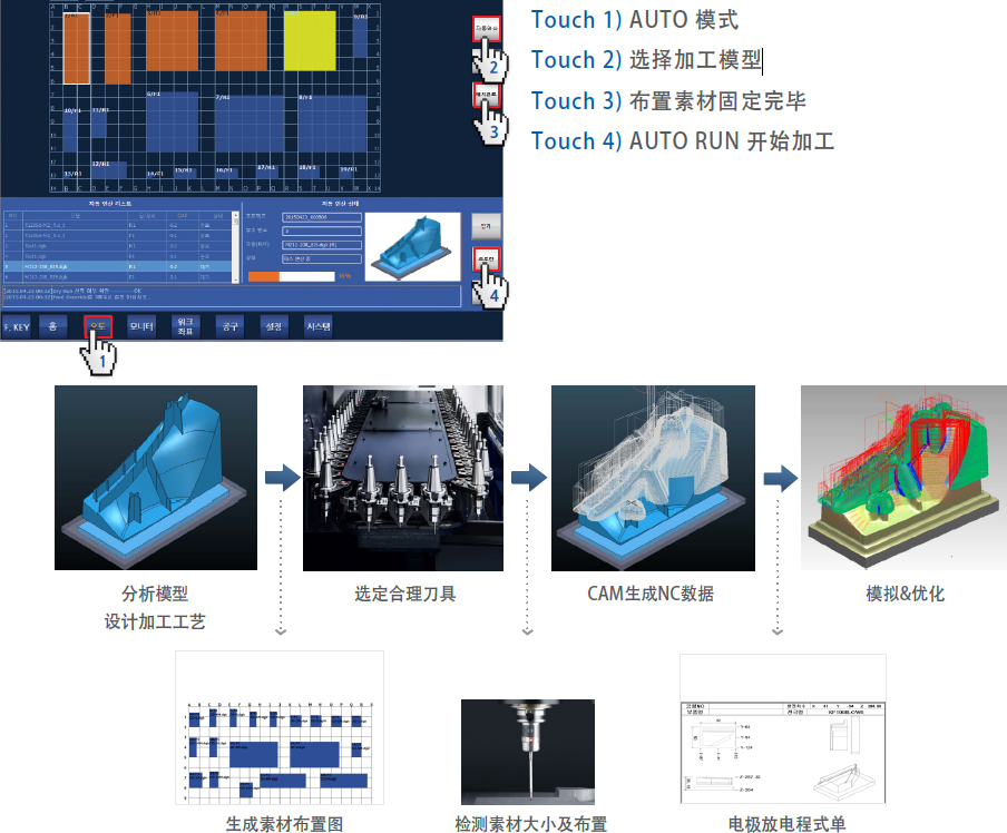 | 1.准备加工 | - 导入模型后准备素材 - 点击4次开始加工 - 10~20分钟准备完毕 | - 模型分析 - CAM 准备NC程序 - 准备刀具 - 加工前检测确认 - 准备素材开始加工 - 4~6个小时 |