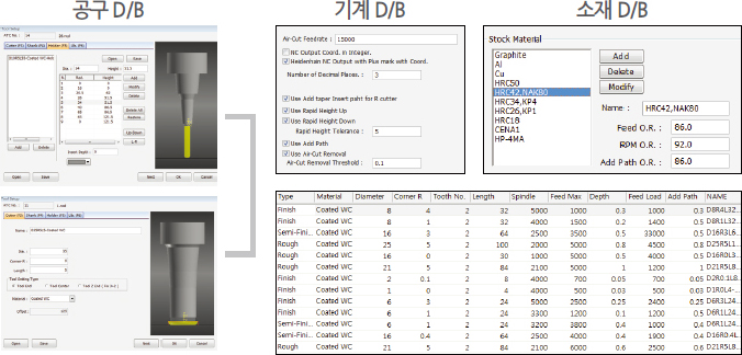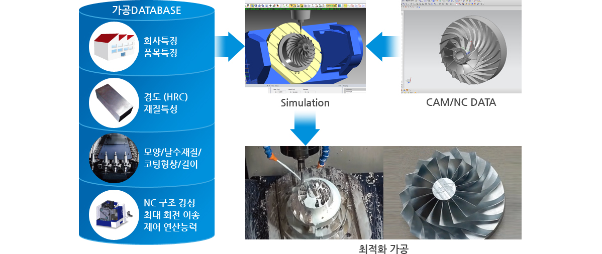 기계, 품목, 소재, 공구에 따른 Data Base를 구축 합니다 CAM에서 만들어진 NC Data Base에 의해 Simulation 하여 줍니다.